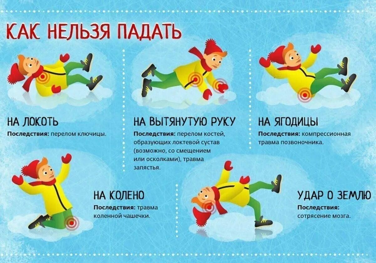·             избегайте падения на спину, удара затылком, повреждения позвоночника и черепно-мозговые травмы могут быть весьма тяжелыми и лечатся долго, а в ряде случаев чреваты и летальным исходом;